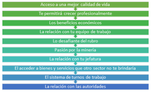 También se destaca que, dentro de las motivaciones para permanecer en el sector, está la compensación económica de trabajar en minería y, consecuentemente, la estabilidad laboral y mejor calidad de vida.