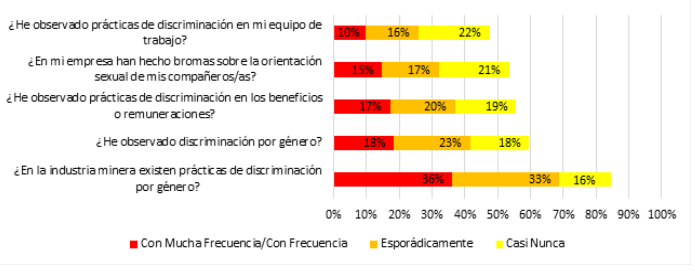 En el aspecto de discriminación de género, el 69% de las trabajadoras afirma que existen prácticas de esta índole, mientras que un 41% refiere haber observado discriminación de este tipo. En relación con los beneficios y remuneraciones, el 37% señala haber presenciado prácticas de discriminación, mientras que un 53% indica que en su empresa se han hecho bromas sobre la orientación sexual de sus compañeras(os), y un 32 % sostiene haber visto prácticas discriminatorias en su equipo de trabajo.