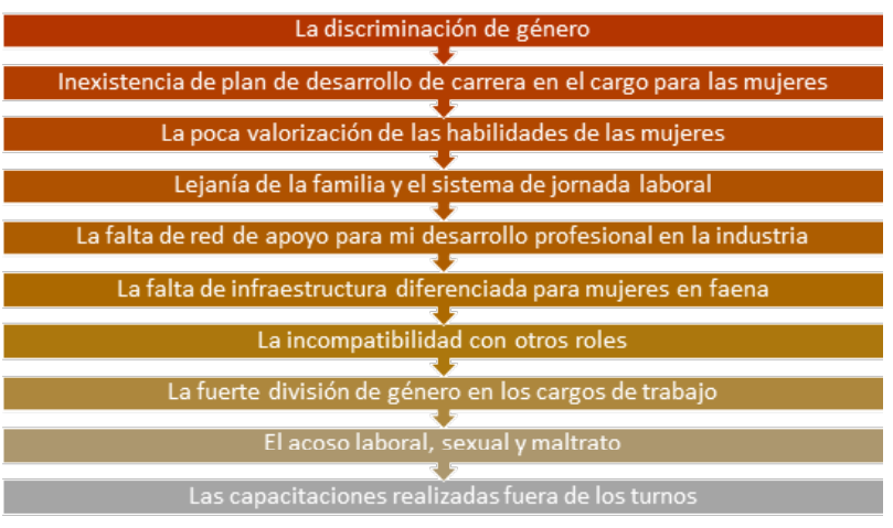 De acuerdo con el estudio, como las principales barreras para trabajar y permanecer en la industria se posicionan: la discriminación de género, la inexistencia de plan de desarrollo de carrera en el cargo para las mujeres, y la poca valorización de las habilidades de éstas.