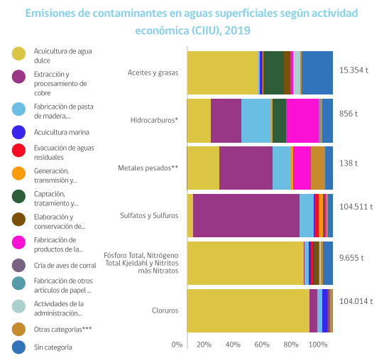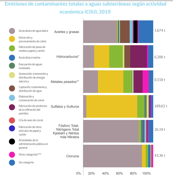Asimismo, donde aún queda por mejorar es en las emisiones de contaminantes a aguas subterráneas y superficiales. Según el REMA 2021, la minería –y en particular la extracción y procesamiento de cobre– es la principal actividad responsable de la presencia de sulfatos y sulfuros en aguas subterráneas, así como de metales pesados, y ocupa el segundo lugar como fuente de hidrocarburos presentes. Lo mismo se repite para el caso de las aguas superficiales (gráficos 5 y 6).